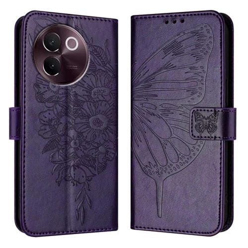 Para Vivo V30E 5G Funda para Teléfono de Cuero con Mariposa En Relieve Global (Púrpura Oscuro)