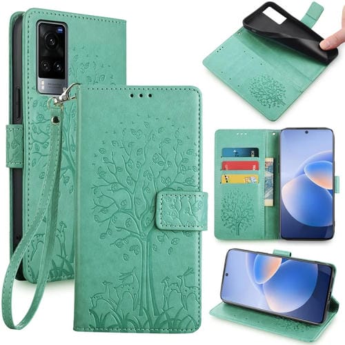 Para Vivo X60 Funda para Teléfono de Cuero con Relieve de Árbol y Ciervo (Verde)