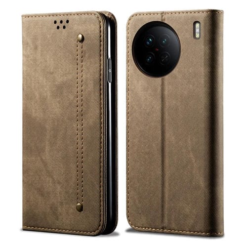 Para Vivo X90 Pro Funda de Cuero con Textura Vaquera para Teléfono (Caqui)