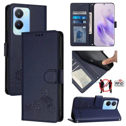 Para Vivo Y02S 4G Global Cat Rat Estuche para Teléfono de Cuero Rfid con Patrón En Relieve y Cordón (Azul)