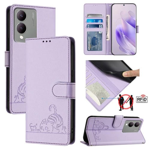Para Vivo Y17S 5G India Cat Rat Estuche para Teléfono de Cuero Rfid con Patrón En Relieve y Cordón (Púrpura)