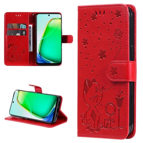 Para Vivo Y28 4G Funda para Teléfono de Cuero con Tapa En Relieve con Diseño de Gato y Abeja (Rojo)