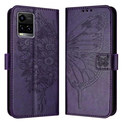 Para Vivo Y33S 4G Global / Y21 2021 / Y21S Funda para Teléfono de Cuero con Mariposa En Relieve (Púrpura Oscuro)