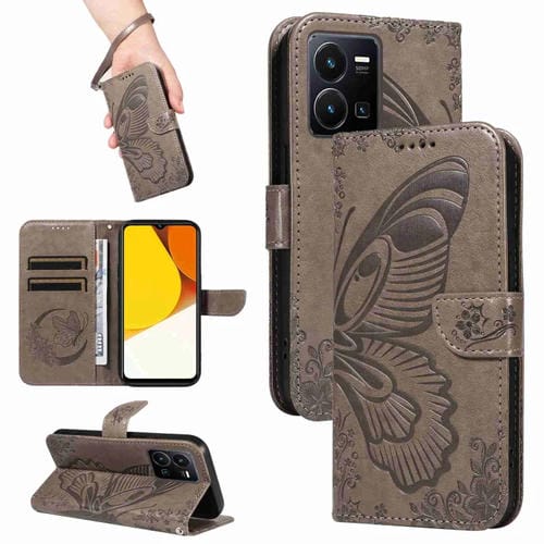 Para Vivo Y35 / Y22S / Y22 Funda para Teléfono de Cuero con Relieve de Mariposa de Cola de Golondrina (Gris)