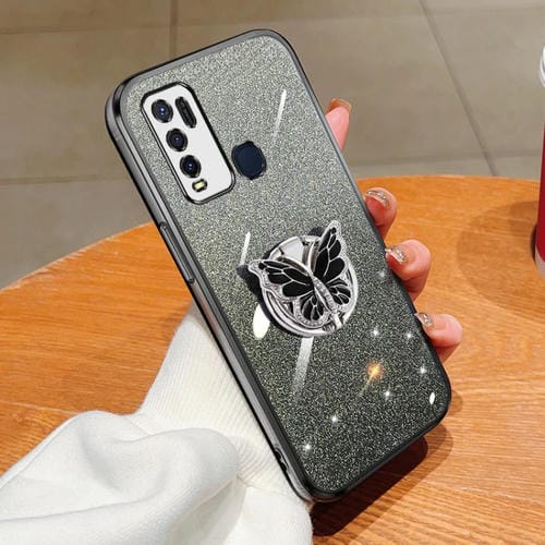 Para Vivo Y50 Funda para Teléfono de TPU con Soporte de Mariposa con Brillo Degradado Plateado (Negro)