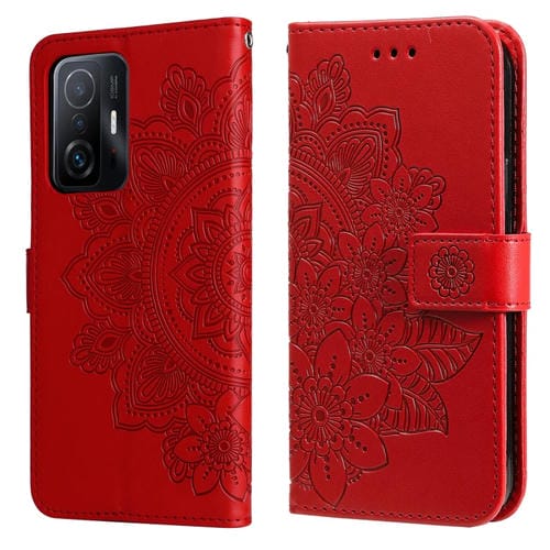 Para Xiaomi 11T / 11T Pro 7-Petal Flores En Relustinación Funda de Cuero Horizontal de Cuero con Soporte y Ranuras para Tarjetas (Rojo)