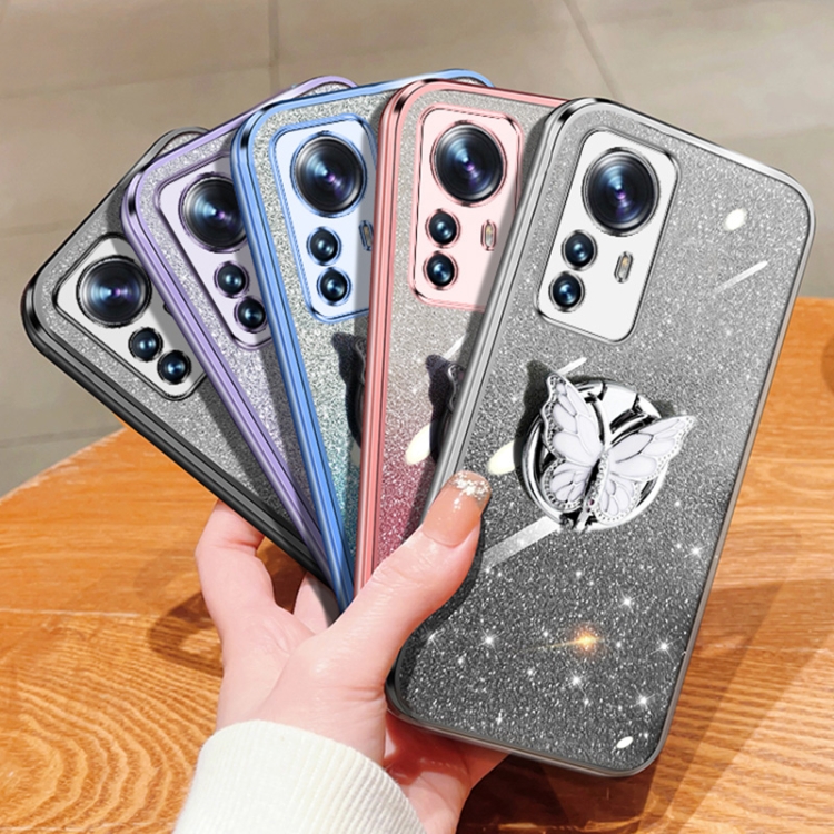 Para Xiaomi 12 Pro Estuche para Teléfono de TPU con Soporte de Mariposa con Brillo Degradado Plateado (Púrpura)