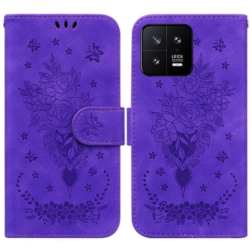 Para Xiaomi 13 5G Butterfly Rose Estuche para Teléfono de Cuero En Relieve (Púrpura)