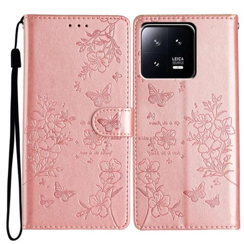 Para Xiaomi 13 Pro Funda de Cuero para Teléfono con Mariposas y Flores (Oro Rosa)