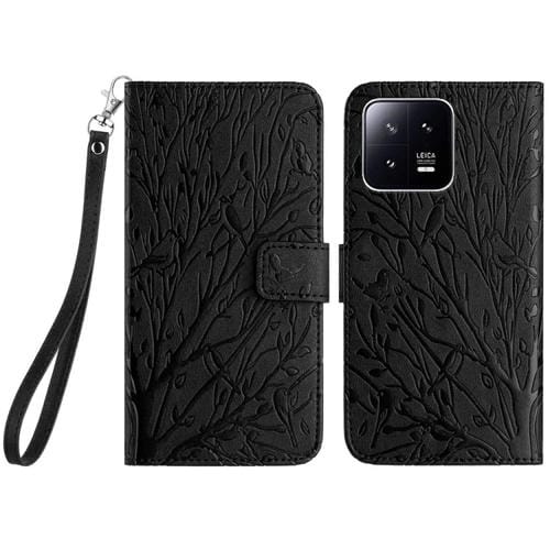 Para Xiaomi 13 Tree Birds Funda de Cuero para Teléfono con Patrón En Relieve (Negro)