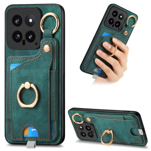 Para Xiaomi 14 Funda Para Teléfono Con Bolsa Para Tarjeta Con Anillo Y Sensación De Piel Retro Con Lazo Para Colgar (Verde)