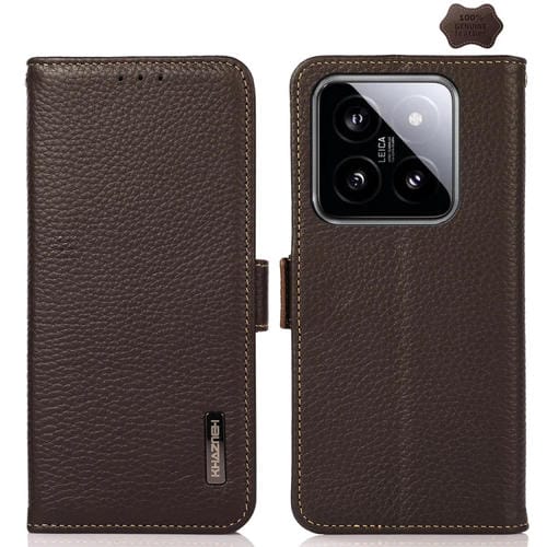 Para Xiaomi 14 Khazneh Funda Para Teléfono Rfid De Cuero Genuino Litchi Lateral Magnético (Marrón)