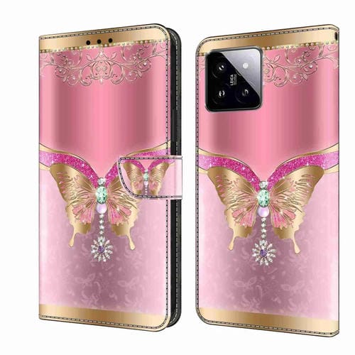 Para Xiaomi 14 Pro Crystal 3D Funda Protectora De Cuero Para Teléfono A Prueba De Golpes (Mariposa Inferior Rosa)