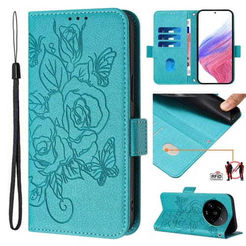 Para Xiaomi 14 Ultra 5G Global Embossed Rose Rfid Funda De Cuero Antirrobo Para Teléfono (Azul Claro)