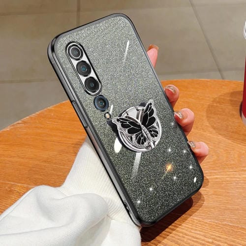 Para Xiaomi Mi 10 Funda para Teléfono de TPU con Soporte de Mariposa con Brillo Degradado Plateado (Negro)