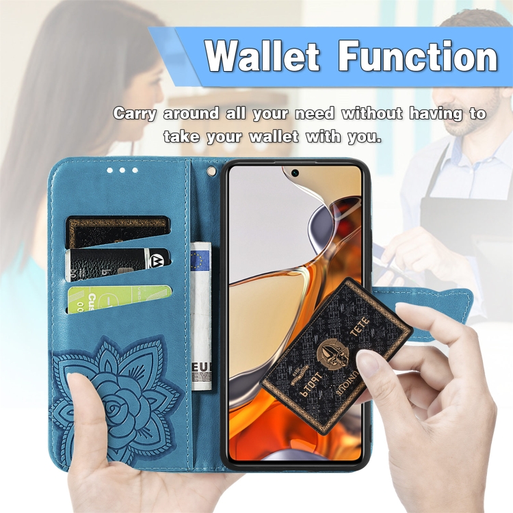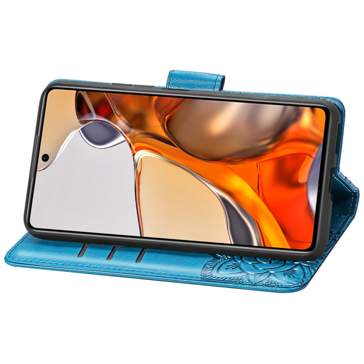 Para Xiaomi Mi 11T / 11T Pro Butterfly Love Flowers En Relieve Caja de Cuero de la Tapa Horizontal con El Soporte y Las Ranuras y la Cartera y El Cordón (Azul)