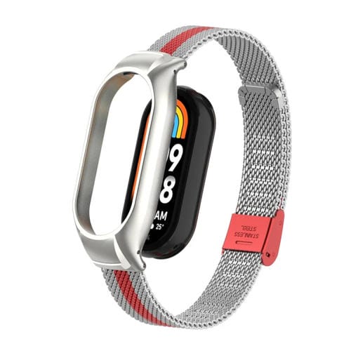 Caja de Metal Integrada para Xiaomi Mi Band 8 + Correa de Reloj con Hebilla de Malla de Acero (Plata + Rojo)