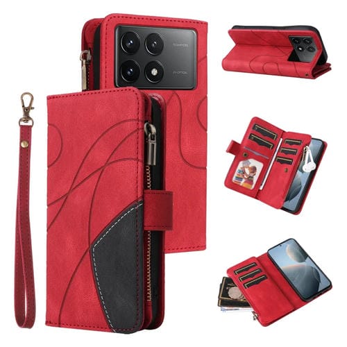 Para Xiaomi Poco F6 Pro Funda de Cuero para Teléfono con Billetera con Cremallera y 9 Ranuras para Tarjetas de Doble Color (Rojo)