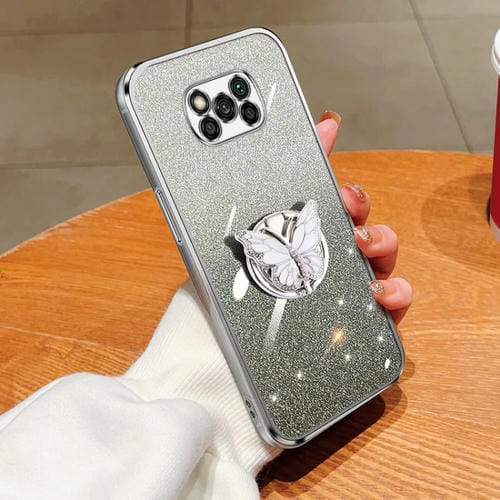 Para Xiaomi Poco X3 Funda para Teléfono de TPU con Soporte de Mariposa con Brillo Degradado Plateado (Plata)