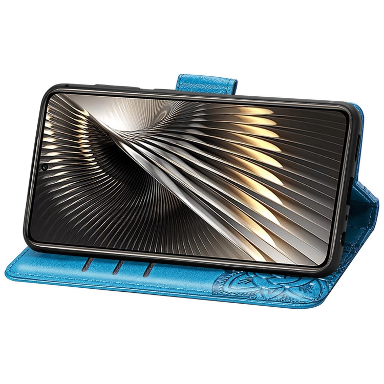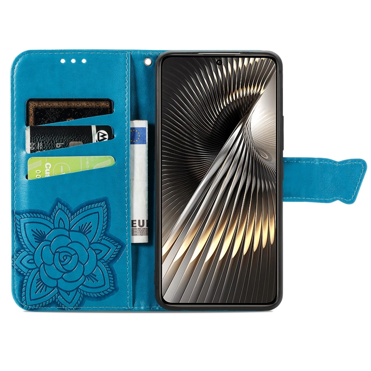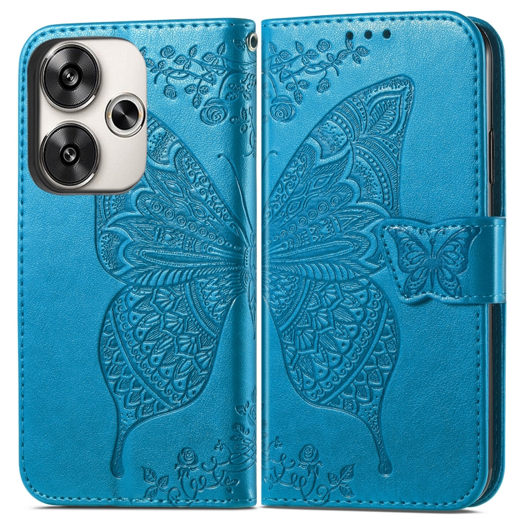 Para Xiaomi Redmi Turbo 3 5G Funda de Teléfono de Cuero con Relieve de Flor de Amor de Mariposa (Azul)