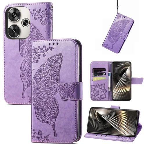 Para Xiaomi Redmi Turbo 3 5G Funda para Teléfono de Cuero con Relieve de Flor de Amor y Mariposa (Lavanda)