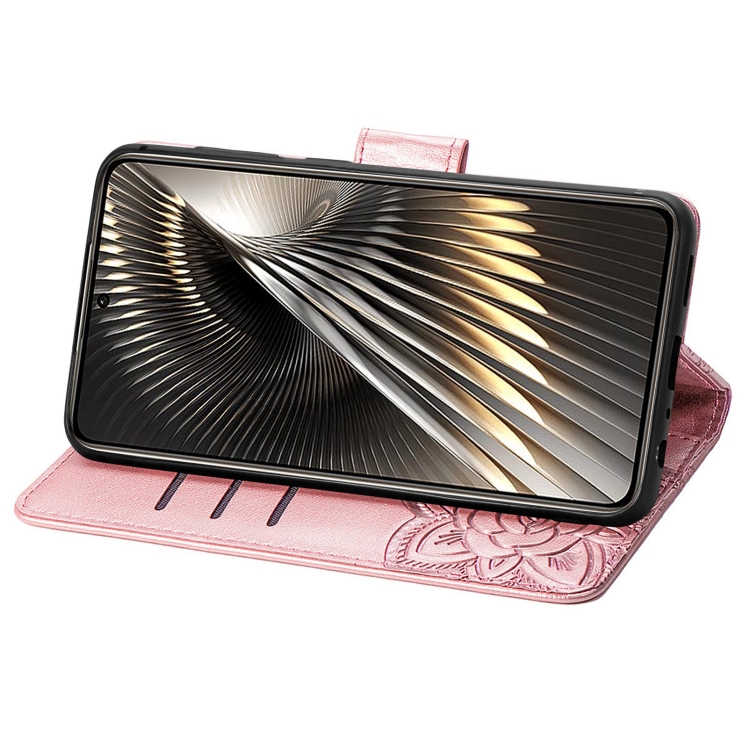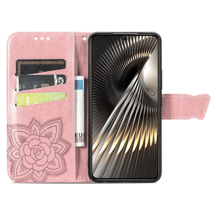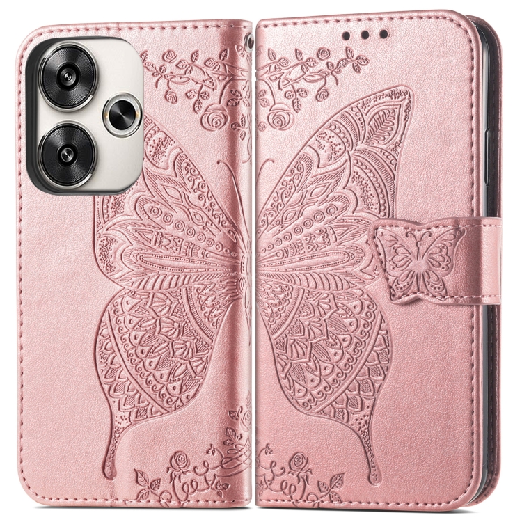 Para Xiaomi Redmi Turbo 3 5G Funda para Teléfono de Cuero con Relieve de Flor de Amor y Mariposa (Oro Rosa)