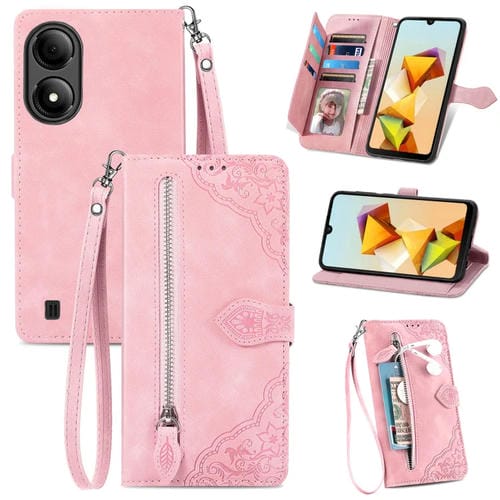 Funda de Cuero para ZTE Blade A33S con Cremallera y Flor en Relieve (Rosa)
