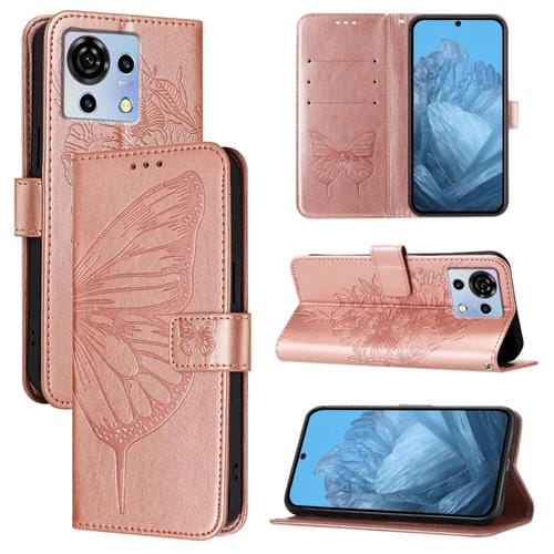 Funda de Cuero para ZTE Blade V50 Vita con Mariposa en Relieve (Oro Rosa)