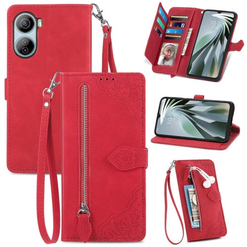 Funda de Cuero ZTE Libero 5G Iv con Cremallera y Flor En Relieve (Rojo)