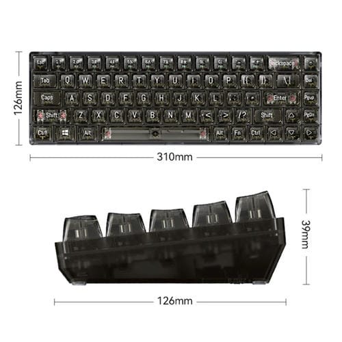 - Formato compacto de 68 teclas; tecnología de Botón: eje mecánico (amarillo, rojo, azul); interfaz USB-C desmontable; voltaje 3,3 V-5,5 V; Corriente 150 mA; dimensiones 310x126x39 mm; peso 427 gramos