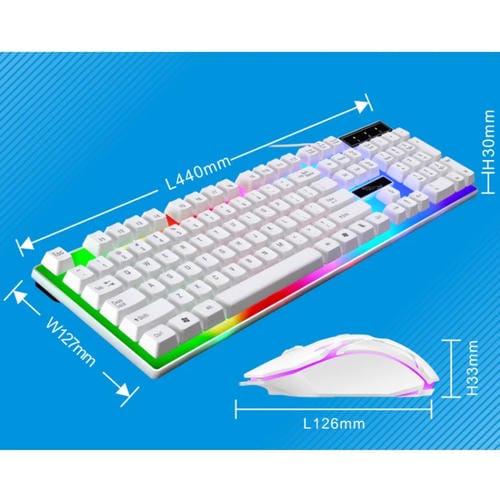 • Retroiluminación Colorful Glow, sensación mecánica, impermeable y resistente al sudor, método de trabajo fotoeléctrico, resolución del Ratón de 1200 ppp, longitud del Cable de 1,5 metros, diseño ergonómico, dimensiones Teclado 44 x 12.7 x 3 cm, dimensiones Ratón 12.6 x 3.3 cm, rueda de goma antideslizante en 3D