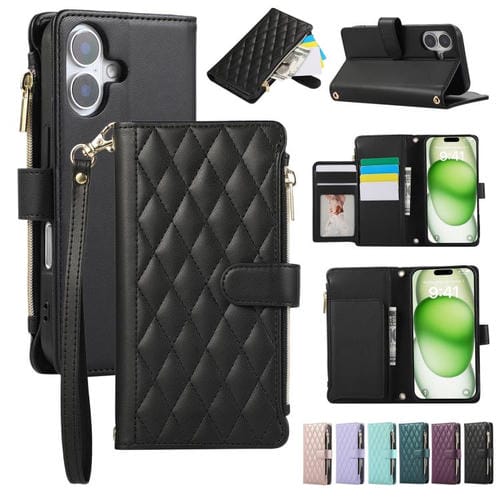 Funda de Cuero Tipo Billetera con Cremallera Rombal para iPhone 16 Plus (Negra)