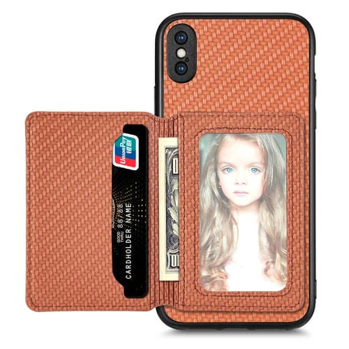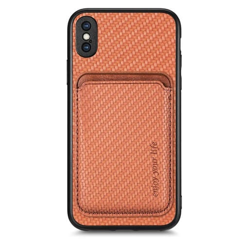 Caja de teléfono para iPhone X Xs con bolsa de tarjeta magnética de fibra de carbono (Marrón)