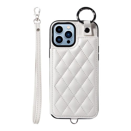 Estuche para teléfono iPhone 13 Pro Max con bolsa para tarjetas textura rómbica y cordón corto (Blanco)