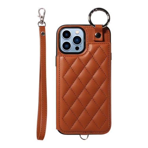 Estuche para teléfono iPhone 13 Pro Max con bolsa para tarjetas textura rómbica y cordón corto (Marrón)