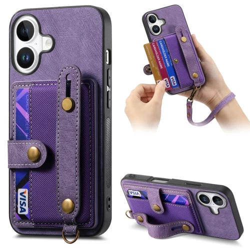 Funda de Cuero Tipo Billetera para iPhone 16 Diseño Pulsera Cruzada Retro (Morado)