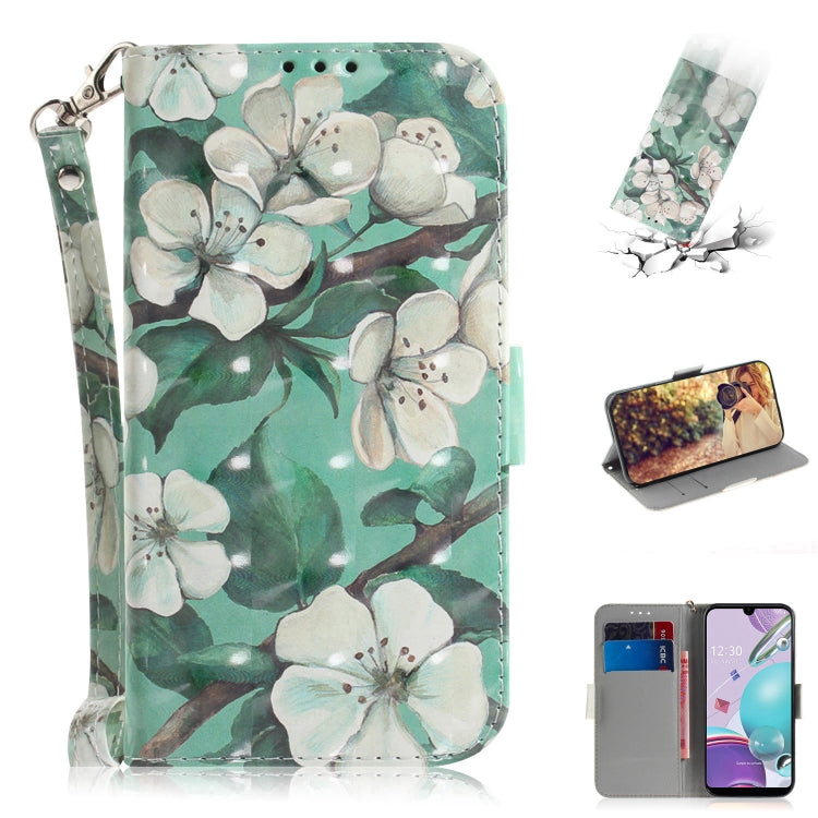 Funda de Cuero Abatible Horizontal para LG Q52 con Dibujo 3D, Soporte, Ranuras y Cordón (Flor de Acuarela)