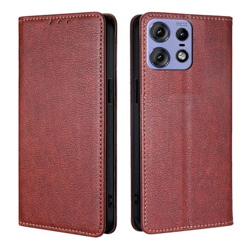 Funda de Cuero Magnética para Motorola Edge 50 Pro 5G con Acabado Brillante y Aceite Sólido (Marrón)