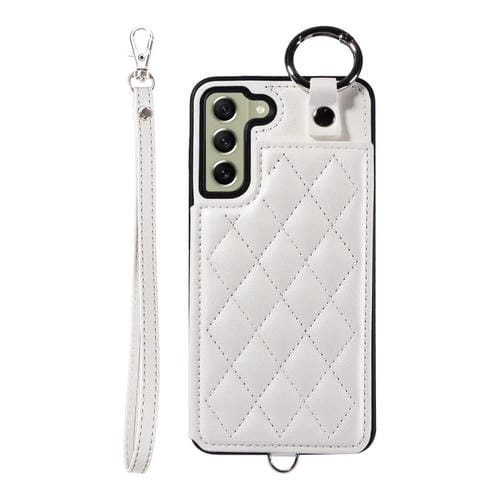 Estuche para Samsung Galaxy S21 FE 5G con Bolsa para Tarjetas Textura Rómbica y Cordón Corto (Blanco)