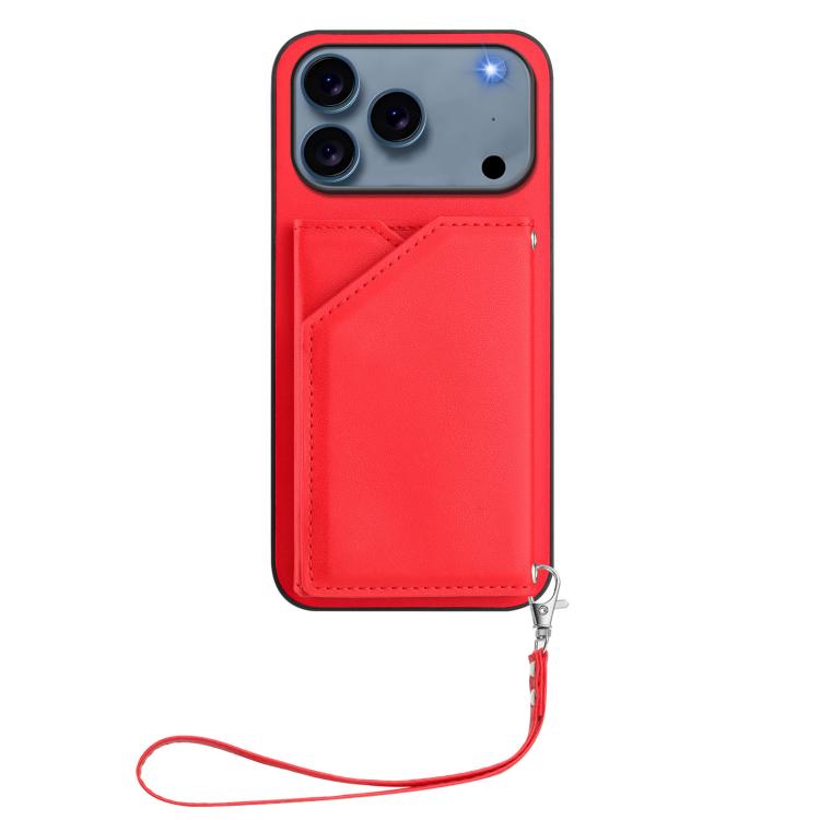 Funda para iPhone 17 Pro Max con cuatro ranuras para tarjetas y correa para la muñeca (roja)