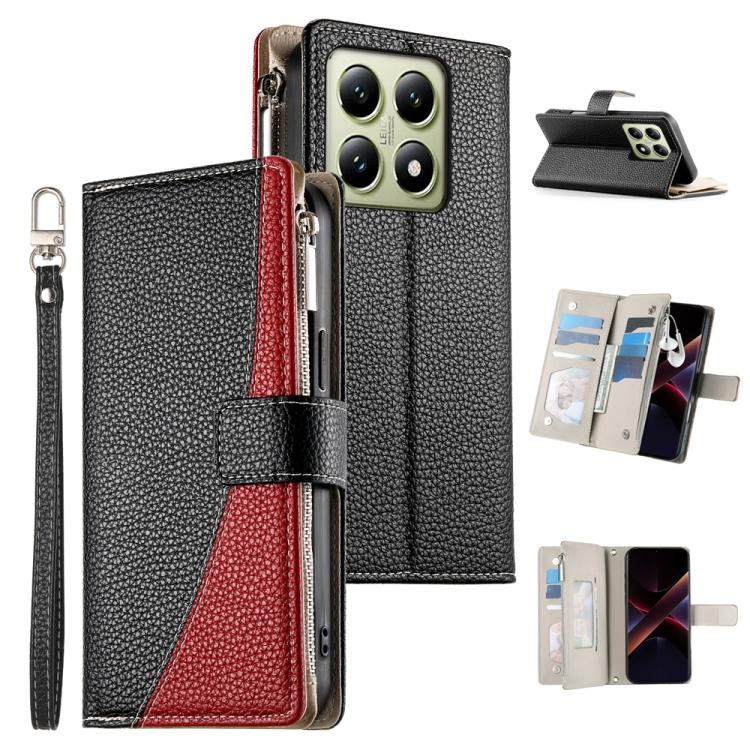 Funda de cuero con cremallera para Xiaomi 14T, con mĂșltiples tarjetas y costuras, con correa corta (negra)
