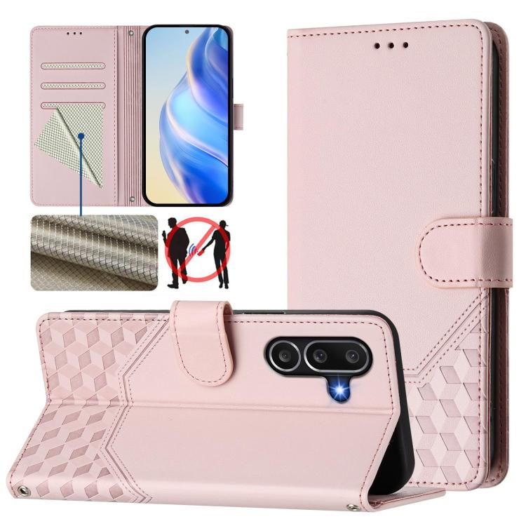 Funda de cuero con relieve de panal RFID para Samsung Galaxy M56 5G (rosa)