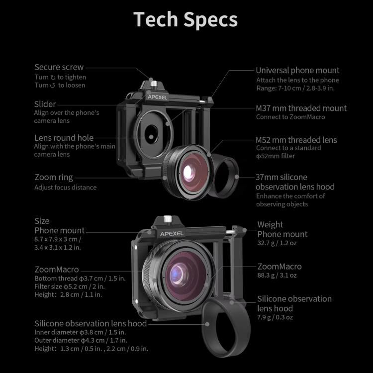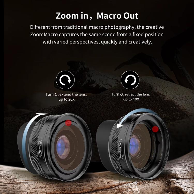 Lente Macro Apexel Apl-Zm100 Enfoque Fijo 10X-20X para Teléfono Celular (Negro)