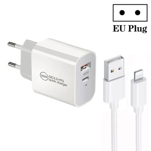 Cargador Dual USB PD30W USB-C y QC3.0 con Cable USB A a 8 Pines 1 m (Blanco)
