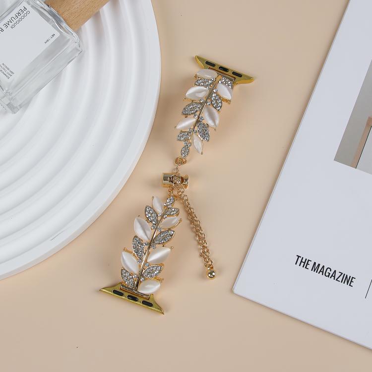 Correa de aleación con diamantes en forma de hoja para Apple Watch de 46 mm, 49 mm, 45 mm y 44 mm (dorada y blanca)