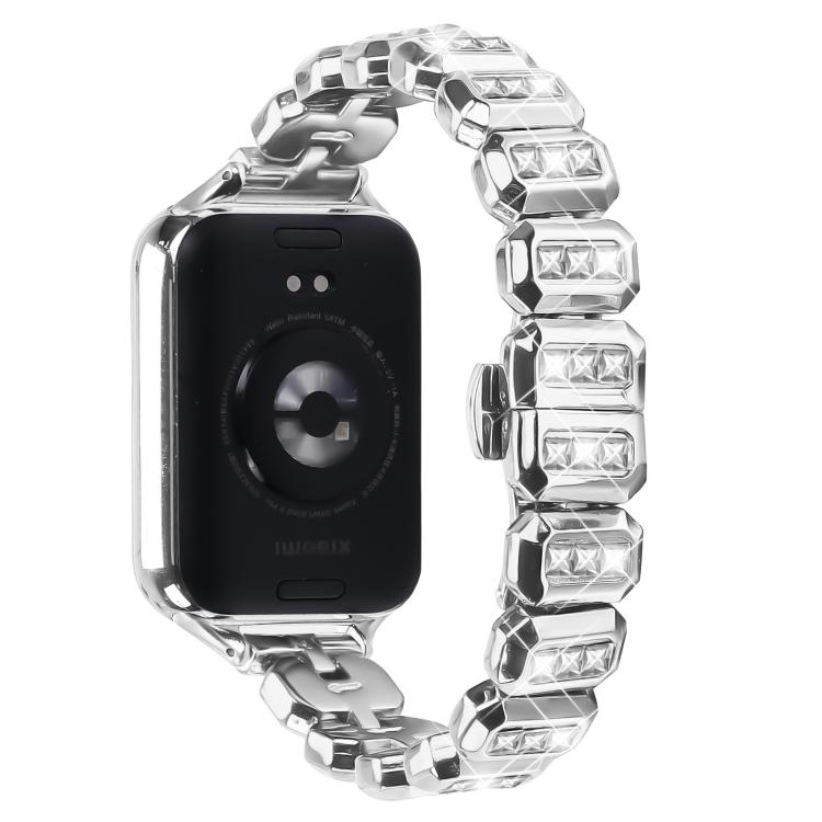 Correa de metal con hebilla de mariposa y diamantes cuadrados pequeños para Xiaomi Mi Band 8 Pro y Redmi Watch 4 (plateada)