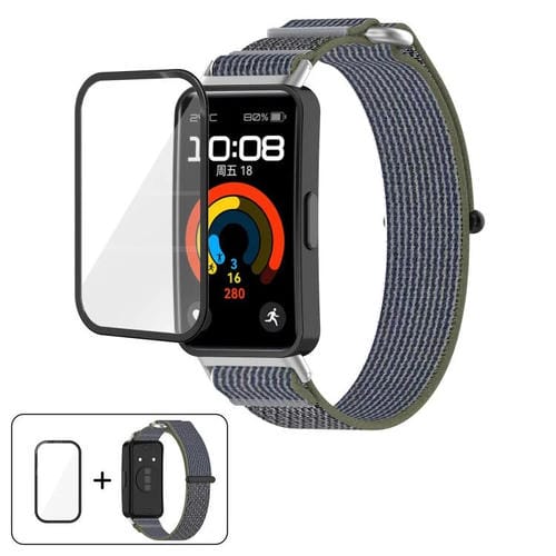 Correa de reloj de nailon con cierre de velcro y película curva 3D para Huawei Band 10/10 NFC Wild Path (verde y gris)