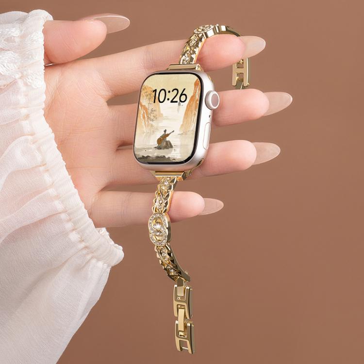Correa fina de acero inoxidable con diamantes para Apple Watch de 42, 44, 45, 46 y 49 mm (dorada)