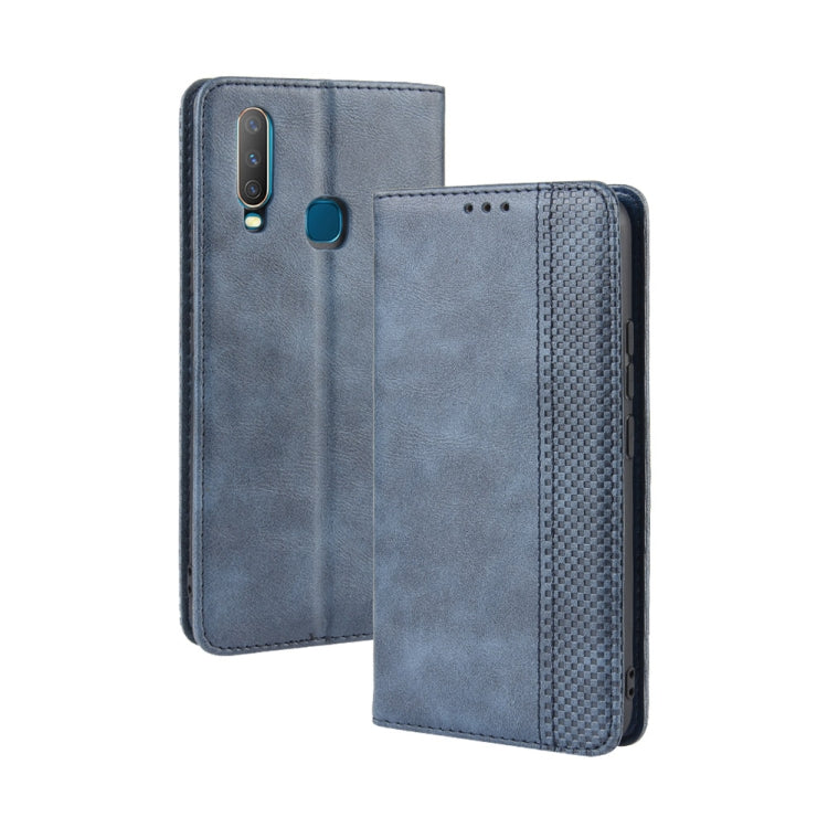 Estuche de Cuero con Tapa Horizontal con Textura de Caballo Loco Retro con Hebilla Magnética para Vivo Y17 / Y15 / Y3, con Soporte, Ranuras para Tarjetas y Marco de Fotos (Azul)