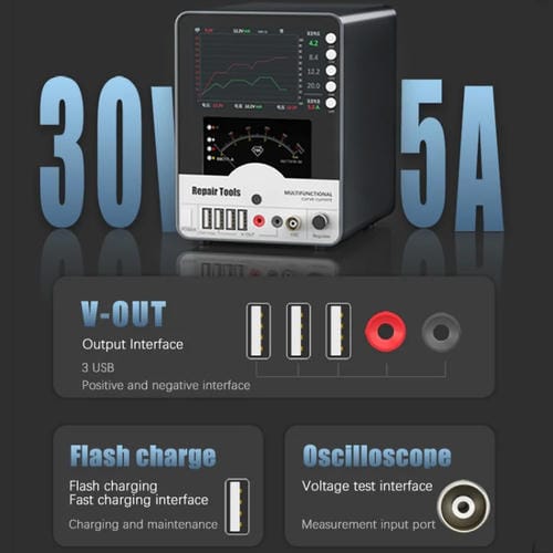 - Potencia máxima de 150 W, voltaje ajustable hasta 30 V, corriente máxima de 5 A, salida regulada por corriente continua con visualización hiperbólica de voltaje y corriente, incluye función de Carga rápida y normal, memoria para cuatro grupos de datos ajustables